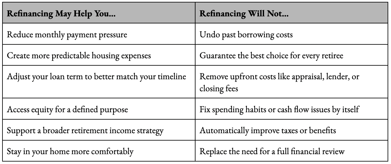 There is no one-size-fits-all answer. For some households, refinancing before retirement can create more stability and breathing room. For others, staying put may be the simpler and stronger option.